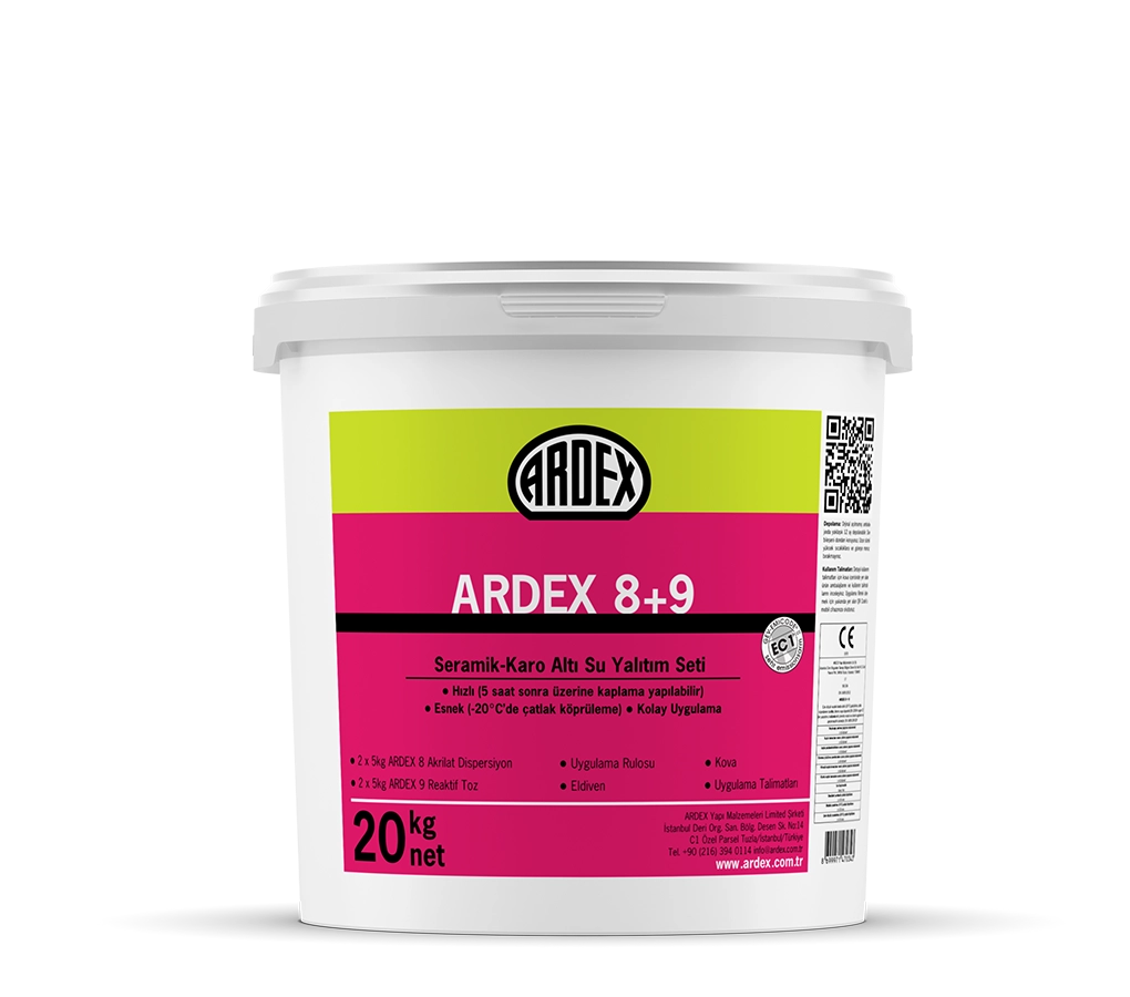 ARDEX 8+9 solvent içermeyen litre ağırlığı yaklaşık 1kg olan akrilat dispersiyon ve kuru yoğunluğu 1,2kg/lt olan çimento esaslı toz malzemeden oluşur. Uygulama, iki ürünün karıştırılmasıyla yapılır.